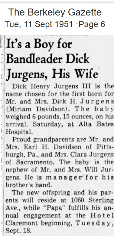 Jurgens Snr was regarded enough within the entertainment industry for the Berkley Gazette to announce the birth of his son in their society pages. In a move that would astound us today, the press also printed the residence address of the Jurgens’ family.