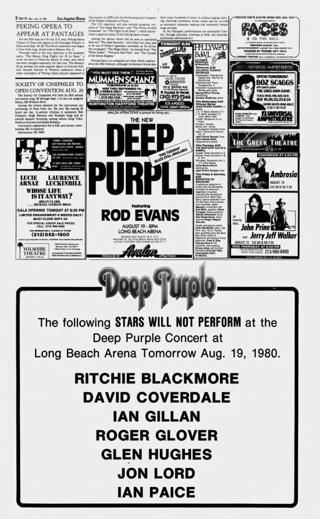 The Monday 18th August edition of the LA Times featured an advert for The New Deep Purple, Featuring Rod Evans. In fairness to the band they were advertised correctly… ‘The New’ and ‘Featuring’ prefixes were not buried or hidden in the lettering, although the words DEEP PURPLE were considerably larger than any other bit of the text. On any other day an advert that size would really stand out in a newspaper. However directly below HEC had delivered a masterstroke. The band were legally allowed to perform after the July ruling but there was nothing stopping Edwards and Coletta from informing the public as to who was and who wasn’t playing in The New Deep Purple.