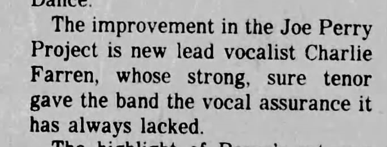 Charlie Farren was notably the singer on the second Joe Perry Project album and toured with the band from 1980 until the end of 1981.